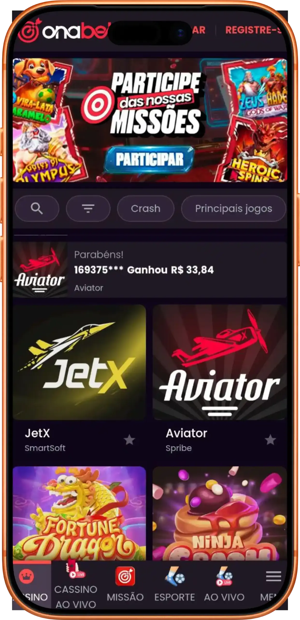 Interface móvel da Onabet para smartphones Android e iOS com jogabilidade otimizada no Brasil.
